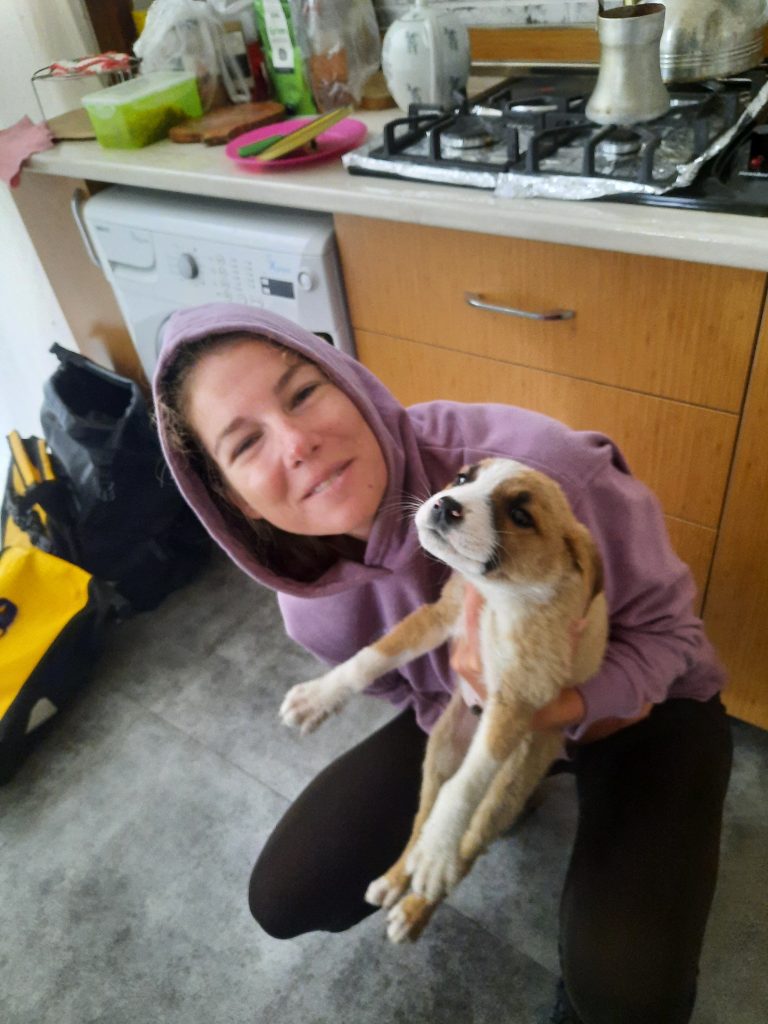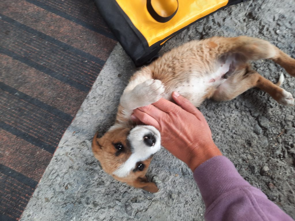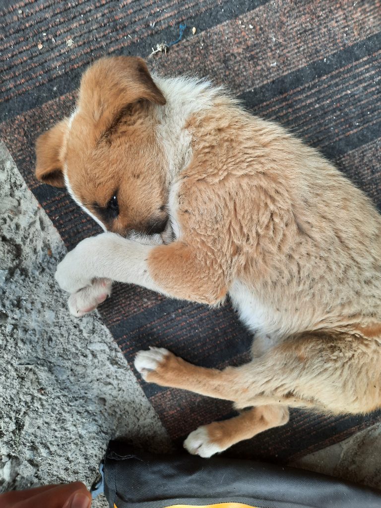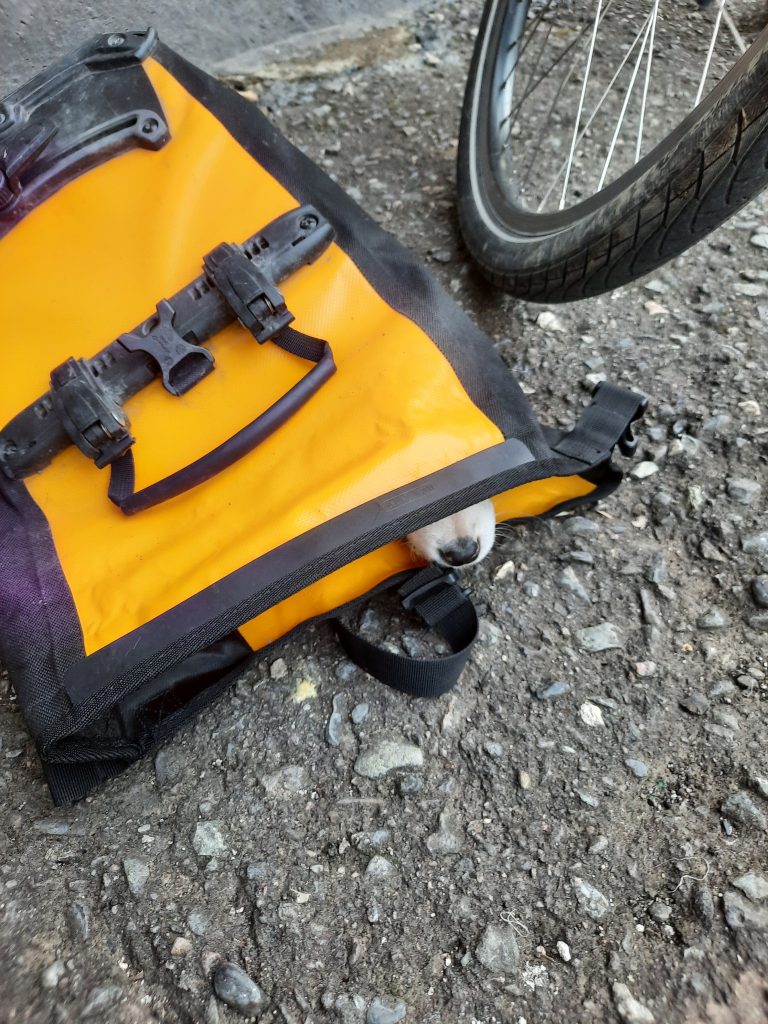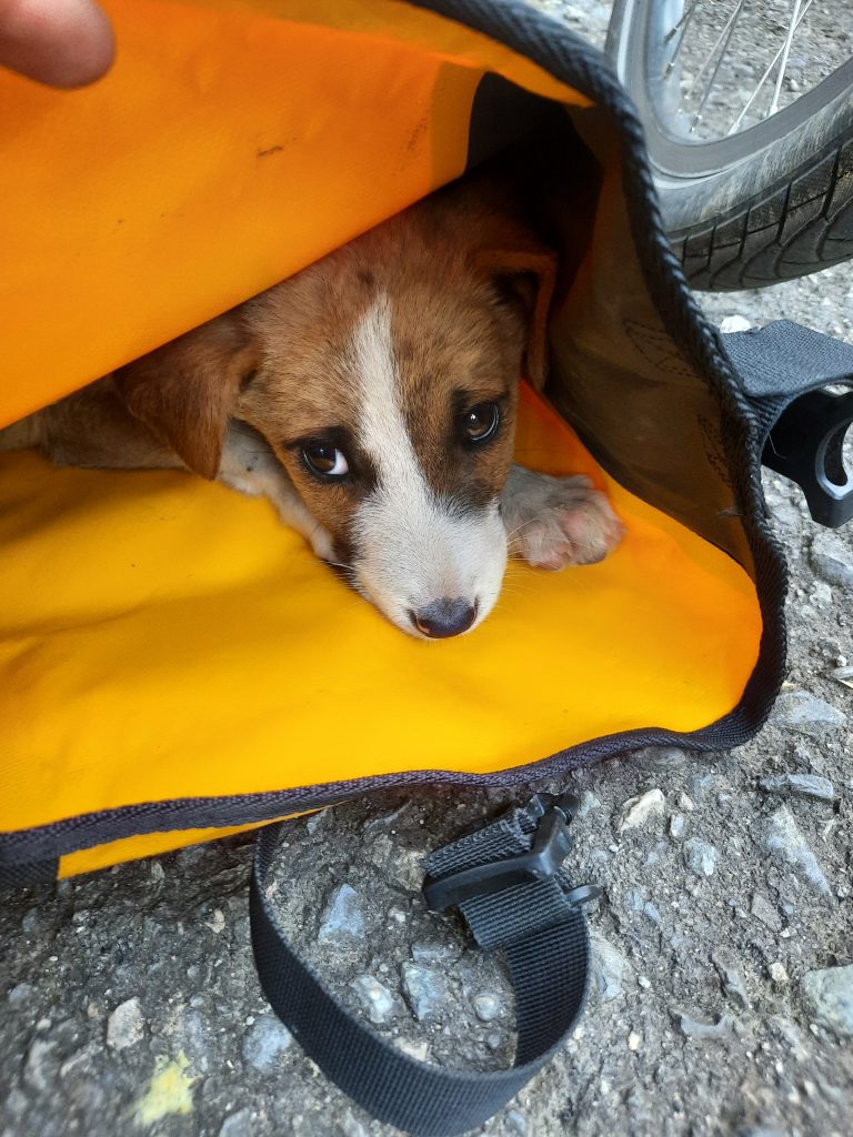 Doch der Kleine läuft uns wieder hinterher. Wir wiederholen das ganze Spiel. Beim dritten Mal ist uns klar: der kleine Hund braucht Hilfe, er wird allein wahrscheinlich nicht überleben. Also verbringen wir ca. eine Stunde mit ihm, bis wir es schaffen, ihn anzufassen und schließlich in eine unserer Fahrradtaschen zu legen. Unser spontaner Plan: bis in die nächste Stadt fahren und ein Tierheim oder Ähnliches finden, wo der Kleine in guten Händen ist.