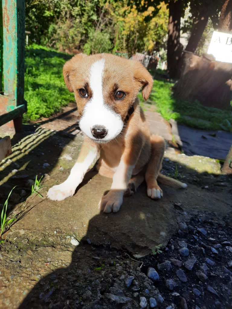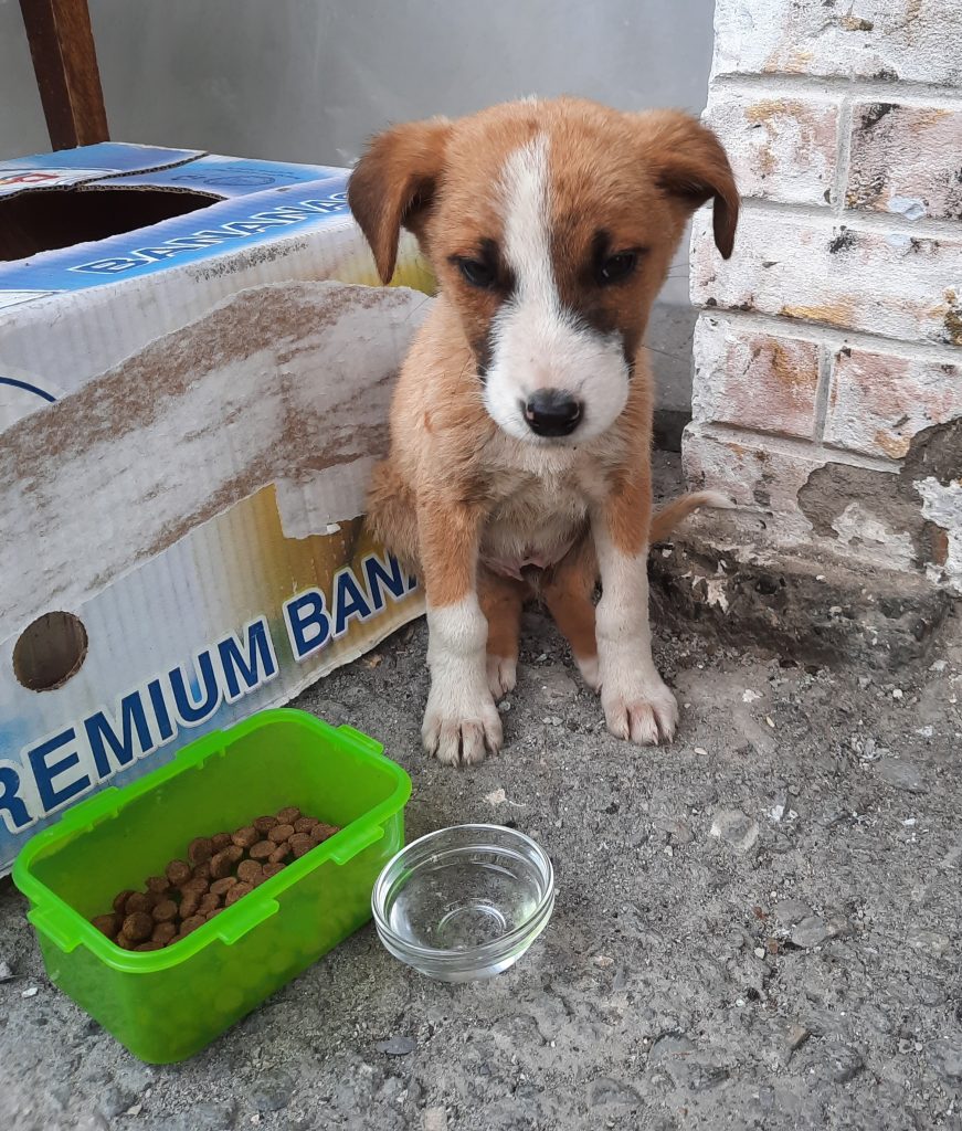 „Vince, hast du den kleinen Hund gesehen?“ rufe ich. „Nö“ bekomme ich als Antwort. Ein paar Sekunden später hören wir aber beide das leise Fiepen hinter uns und halten an. Ein süßer, aber verdreckter und schwacher Welpe versuchte unsere Aufmerksamkeit zu bekommen und bei dem Anblick konnten wir natürlich nicht einfach weiterfahren. Wir schauten uns um, ob nicht irgendwo andere Hunde, zum Beispiel Geschwister oder Eltern zu finden sind. Aber weit und breit keine Spur. Nur vorbeitosende LKW, die einen ohrenbetäubenden Lärm verursachen. Es ist für uns schon schwer erträglich, hier am Straßenrand zu stehen, wie muss das nur für das junge Hündchen sein?
