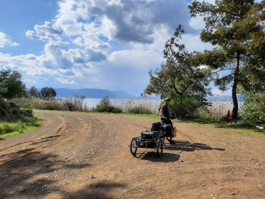 Am Nachmittag erreichen wir die Stadt Akyaka und die Suche nach einem Campingspot wird mal wieder zur Herausforderung. Wir wären heute sogar mal auf einen offiziellen Campingplatz gegangen, aber alles scheint saisonbedingt noch geschlossen zu sein. Gegen Abend finden wir dann an einem kleinen Strand ein ruhiges Plätzchen, wo wir uns für die Nacht niederlassen. Nach einer kurzen Nacht – es kamen doch noch ein paar Besucher zum Strand und Armin schlug jedes Mal Alarm – stand wieder eine anstrengende Etappe mit reichlich Bergaufstrampeln auf dem Programm.