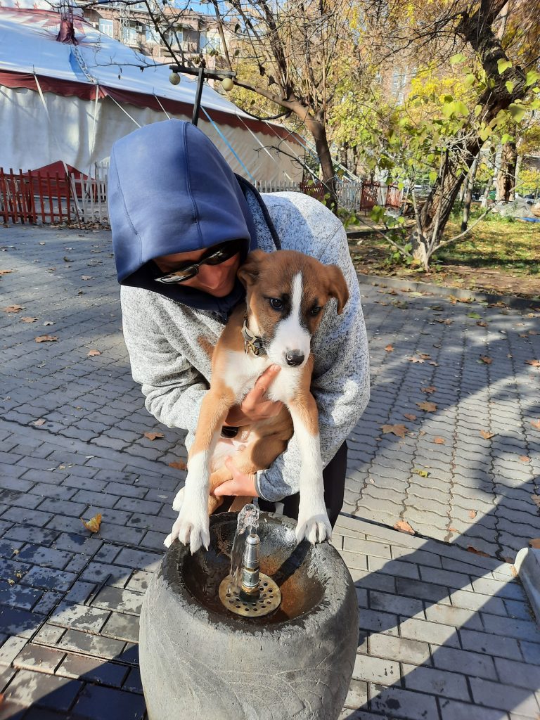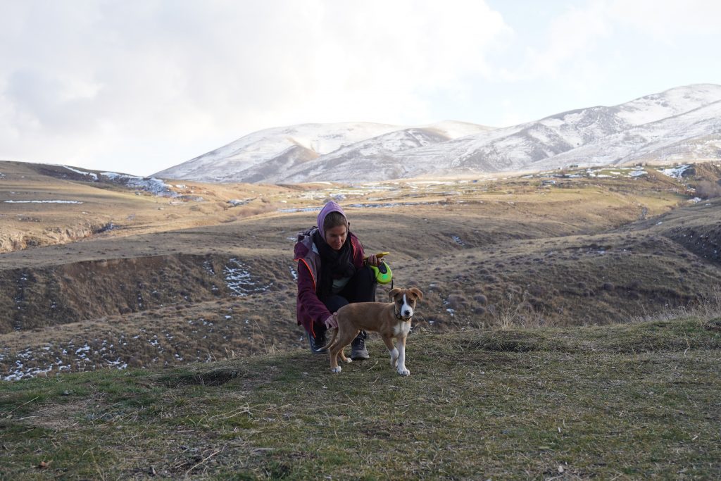 Wir hatten uns vorab für eine Woche eine hundefreundliche Unterkunft gebucht und mussten nur noch einen Mietwagen organisieren, um in den Süden von Armenien zu fahren und unseren Welpen abzuholen. Es stand also noch einmal eine sechsstündige Autofahrt an durch all die Landschaften, die wir im Herbst per Rad erkundet hatten. Die rötlichen Baumkronen hatten sich nun in schneebedeckte Gipfel verwandelt. Ein seltsames Gefühl, diese Strecke durch endlos scheinende Gebirgszüge nun bequem im Auto zurückzulegen.