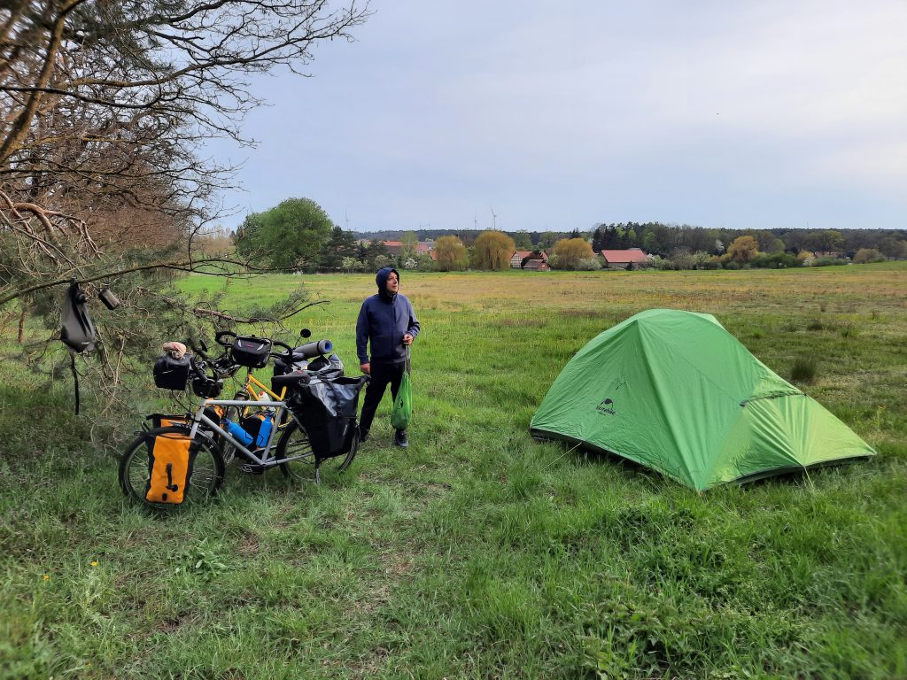 Wir radeln also bei allerschönstem Frühlingswetter durch Brandenburg und finden abends einen passablen Platz für unser Nachtlager. Die erste Nacht im Zelt! Zugegeben, die Nacht war ziemlich kalt und als wir am nächsten Morgen nach draußen schauen, ist es düster und dunkle Regenwolken sind im Anmarsch. Wir beschließen, erst einmal loszuradeln und abzuwarten, wie sich das Wetter entwickelt. Leider ziehen die Wolken nicht ab und es regnet immer wieder. Dazu noch die Kälte. Schnell wird klar: wir brauchen eine Unterkunft für die Nacht. Also telefonieren wir mit gut zehn Hotels in der Umgebung, bis wir endlich ein Zimmer ergattern können. So haben wir uns den Start unserer Reise nicht vorgestellt!